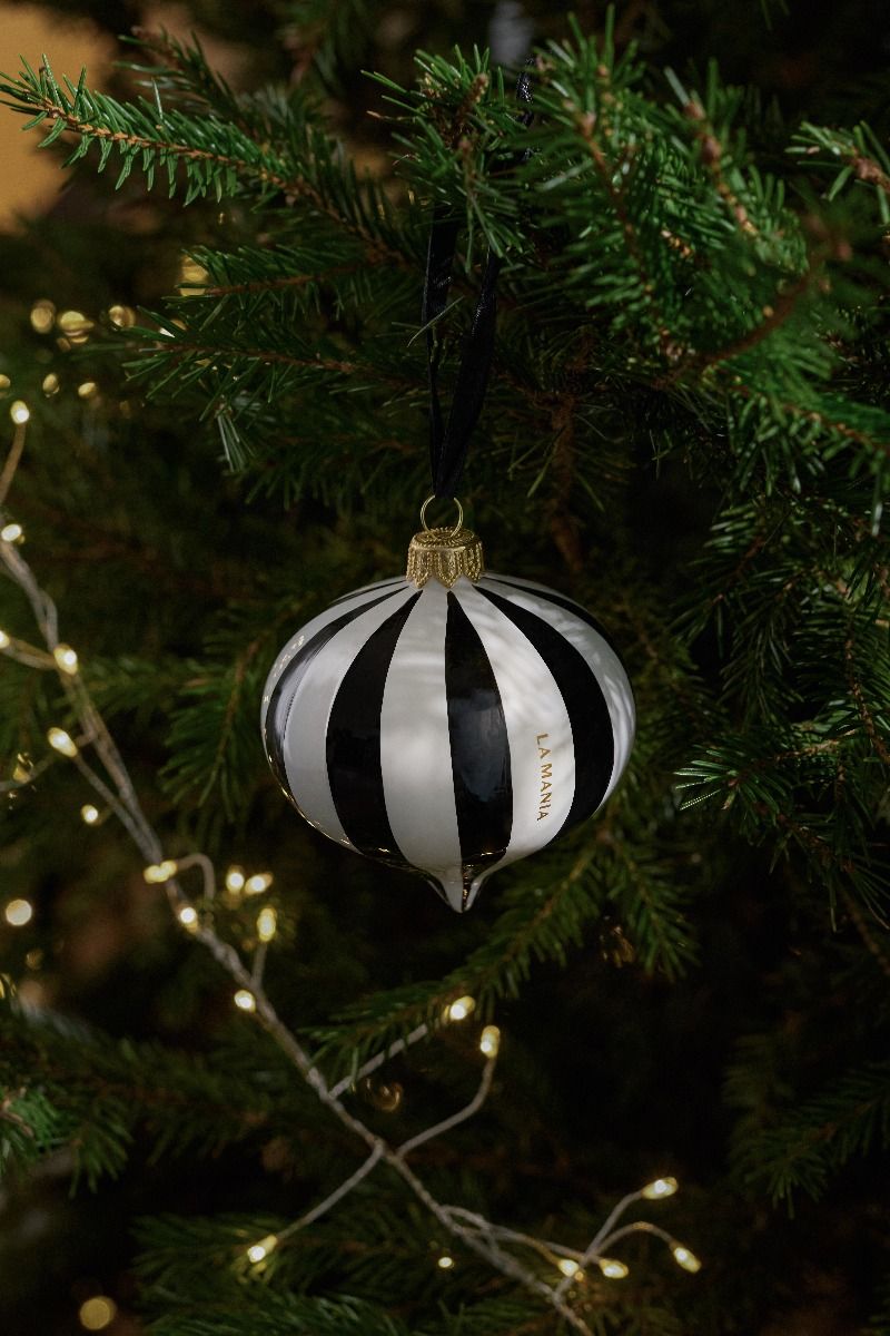 Bombka inspirowana kultową kolecją stripes. Każda bombka jest unikatowa ze względu na ręczne dmuchanie i zdobienia, które powstały w lokalnej, rzemieślniczej manufakturze. Bombka posiadają czarną, satynową zawieszkę.Zalecamy czyszczenie produktu wilgotną ściereczką bez użycia detergentów. Wyprodukowano w Polsce