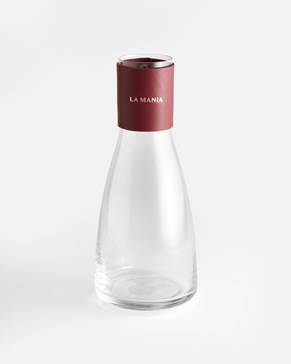 Karafka Fiore została zaprojektowana jako subtelne dopełnienie stołu - zarówno na co dzień, jak i podczas wyjątkowych okazji. Jej delikatnie zwężająca się forma nawiązuje do motywu kwiatu będącego inspiracją całej kolekcji. Wykonana z bezołowiowego szkła kryształowego zachwyca przejrzystością, delikatnym połyskiem i wyjątkową lekkością. Kształt karafki nie tylko pięknie eksponuje zawartość, ale także umożliwia wygodne serwowanie napojów. Dodatkowym elementem dekoracyjnym jest mankiet wykonany z najwyższej jakości włoskiej skóry naturalnej w odcieniu bordo, który ułatwia przenoszenie i podkreśla unikatowy charakter projektu. Subtelne logo LA MANIA, umieszczone na powierzchni szkła, podkreśla minimalistyczny charakter projektu i wpisuje się w estetykę marki.