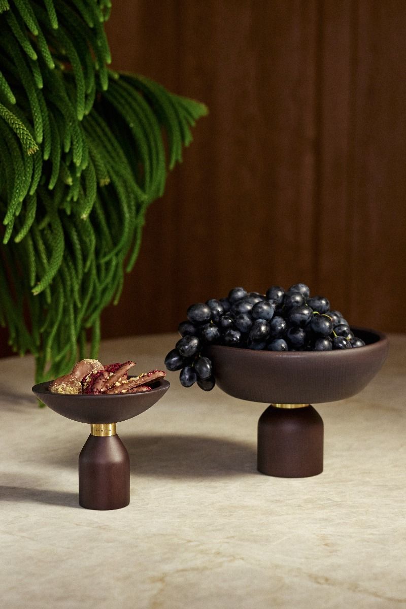 Smukła misa Male II Large osadzona na cokole z litego drewna bukowego, ozdobionym mosiężną obręczą. Naturalny rysunek słojów drewna podkreśla unikalny charakter każdej sztuki, a miękka, harmonijna forma nawiązuje do współczesnej architektury. Minimalistyczny mosiężny detal dodaje wyrafinowania, łącząc funkcjonalność z estetyką rzeźby użytkowej. Misa jest dopełnieniem kultowej kolekcji Male.