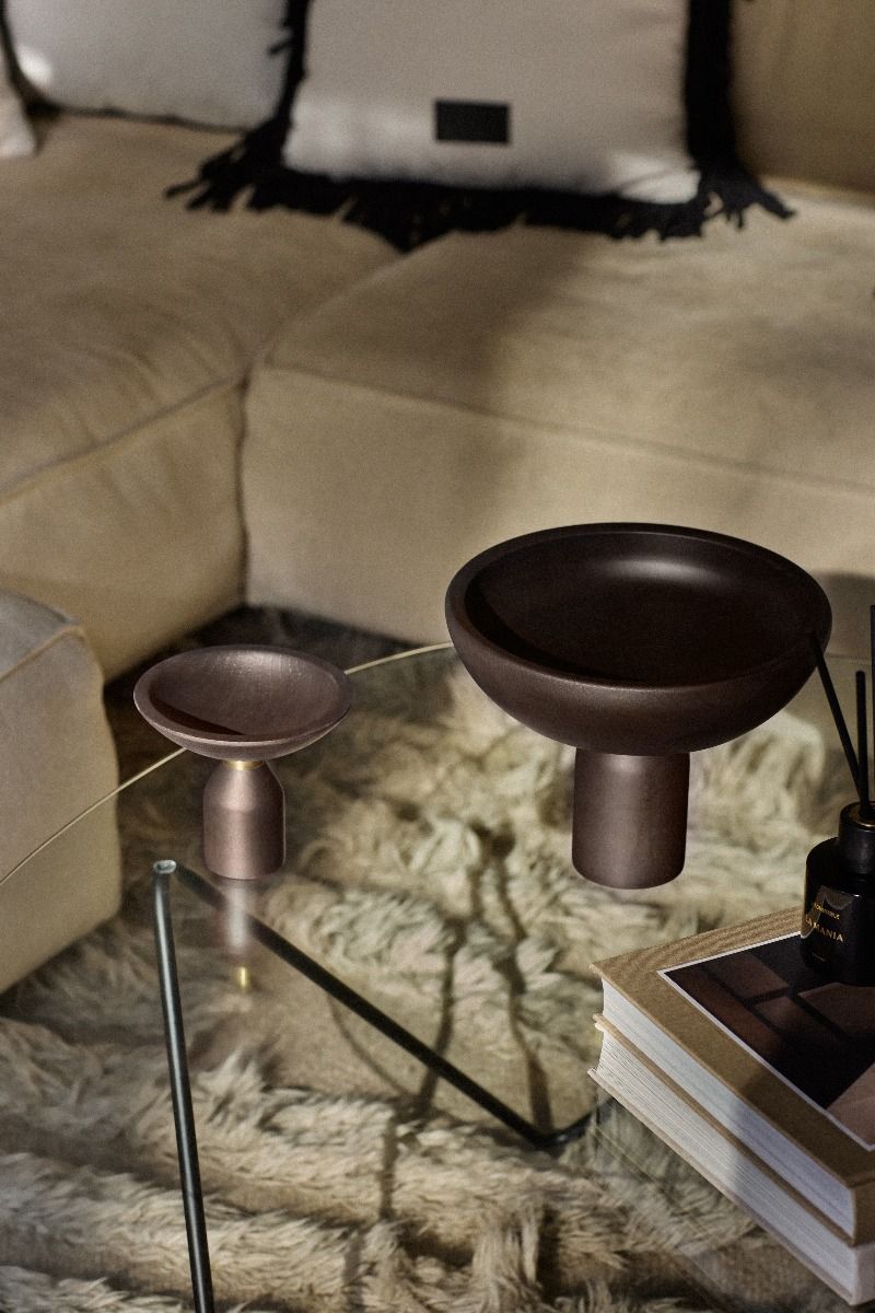Smukła sylwetka misy wznosi się na starannie wykonanym cokole z wysokiej jakości drewna bukowego, zdobionym efektowną mosiężną obręczą. Całość została zaprojektowana jako rzeźba użytkowa, łącząca estetykę z funkcjonalnością. Misa, wykonana z litego drewna bukowego, zachwyca precyzją wykonania i naturalnym rysunkiem słojów. Jej miękka, harmonijna forma nawiązuje do linii współczesnej architektury, a mosiężny detal podkreśla czystość kształtu i szlachetność użytych materiałów.