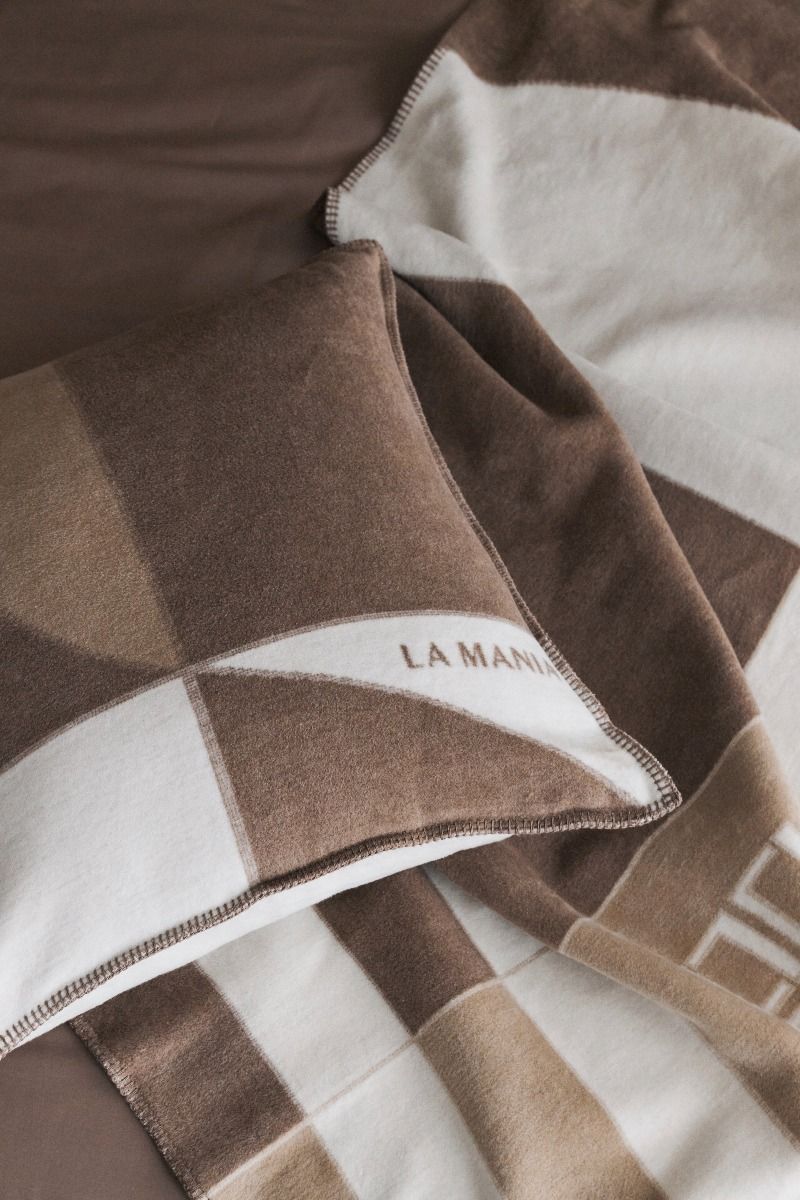 Poduszka Pellure I to projekt, w którym geometryczne formy układają się w mozaikowy wzór inspirowany techniką forniru.