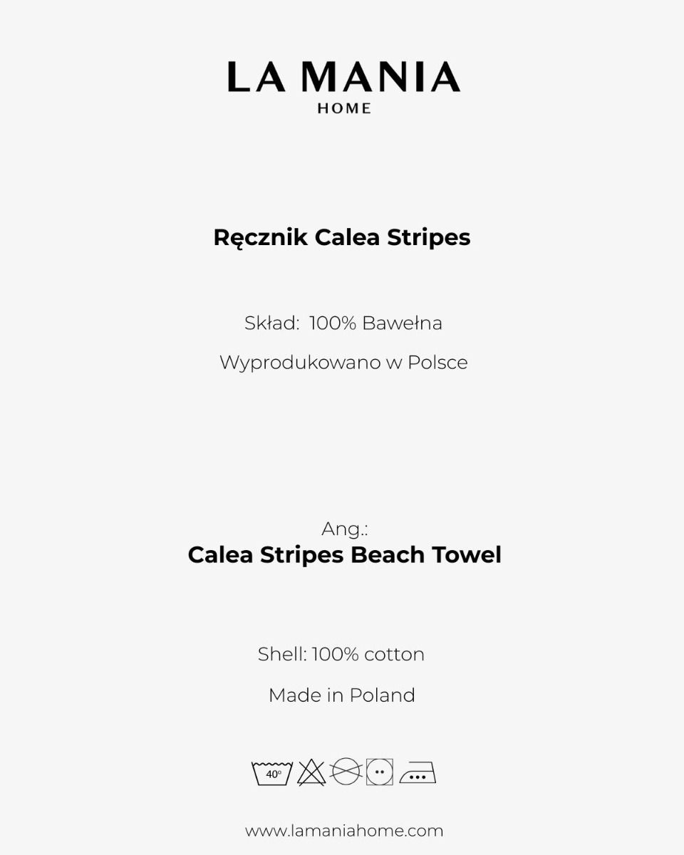 Ręcznik Calea Stripes to praktyczny i stylowy dodatek na lato. Utrzymany w ponadczasowej palecie czerni i bieli, wyróżnia się wyrazistym wzorem w pionowe pasy, który nadaje mu nowoczesnego charakteru. Całość dopełnia logo La Mania, podkreślające jego elegancki design.