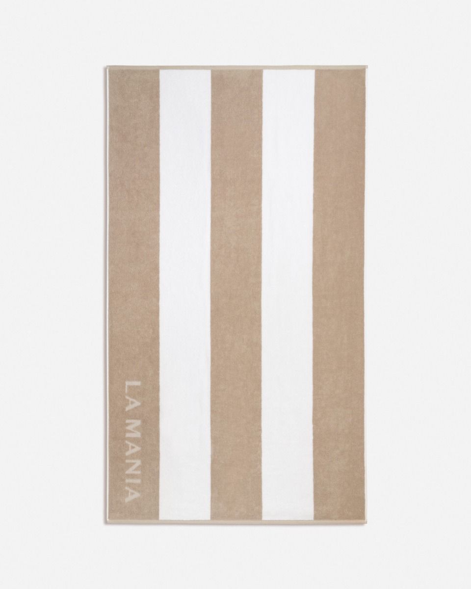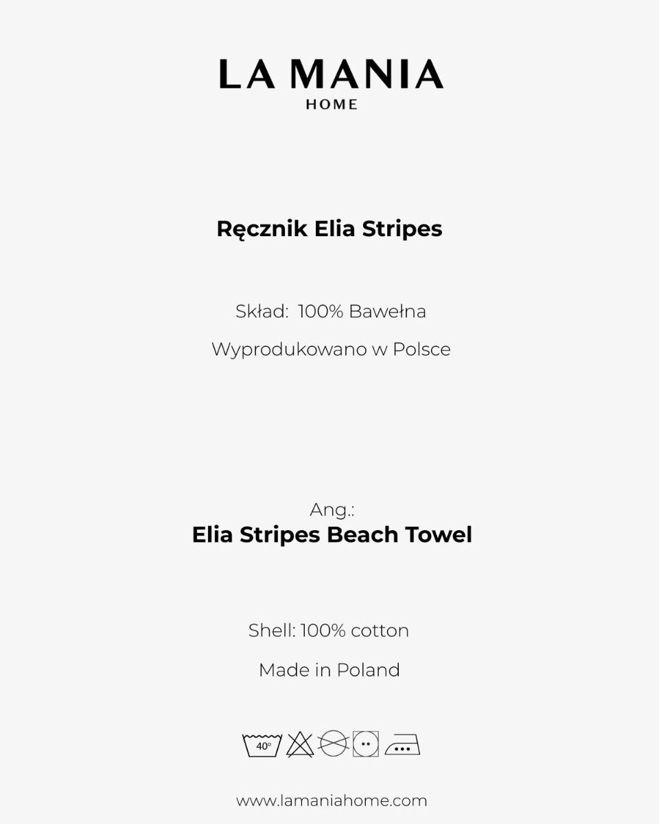 Ręcznik Elia Stripes to praktyczny i stylowy dodatek na lato. Utrzymany w ponadczasowej palecie beżu i bieli, wyróżnia się wyrazistym wzorem w pionowe pasy, który nadaje mu nowoczesnego charakteru. Całość dopełnia logo La Mania, podkreślające jego elegancki design.