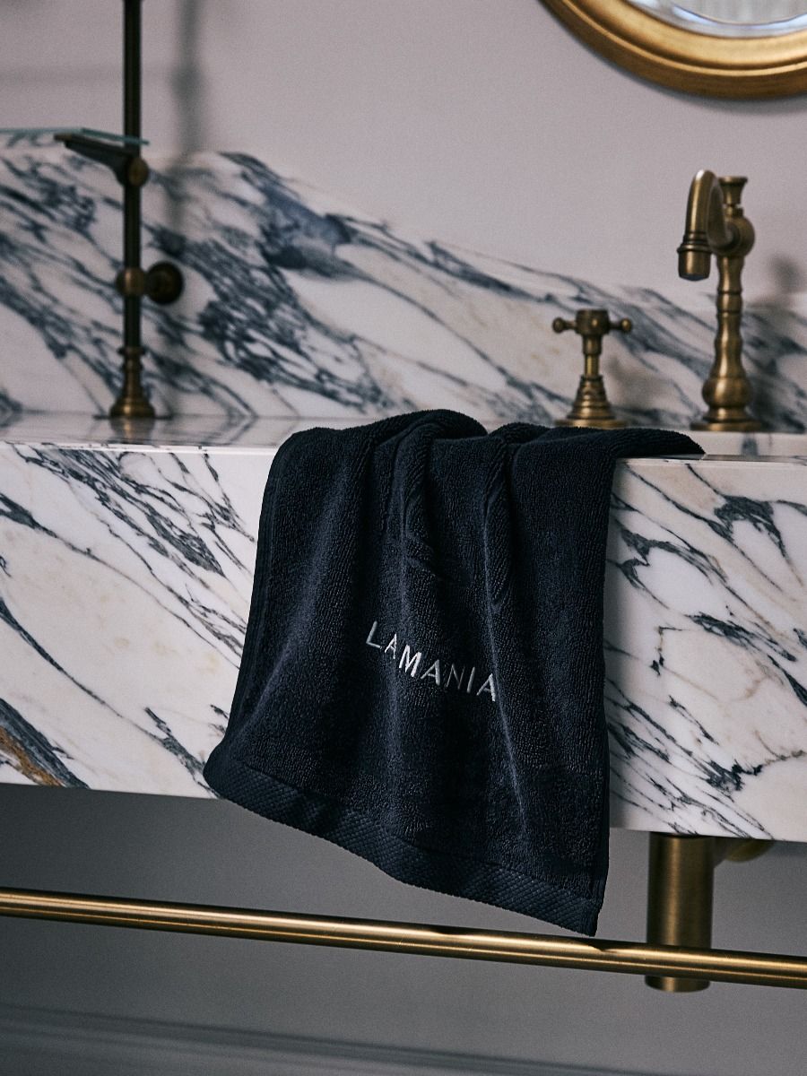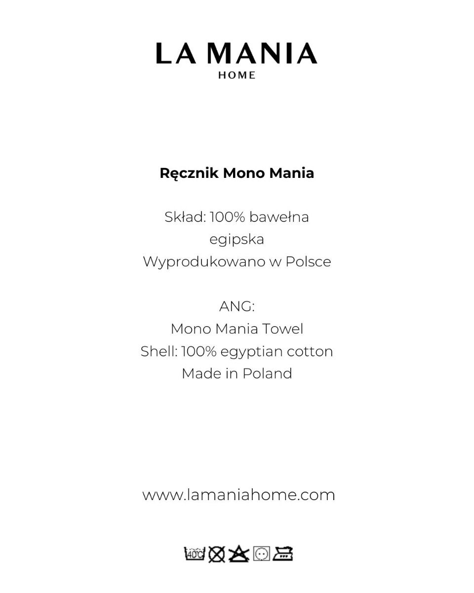 Ręcznik Mono Mania Black jest welurowy, dlatego cechuje się wyjątkową odpornością na zaciągnięcia i szybkim wysychaniem. Dzięki subtelnej pętelce spójnej z estetyką ręcznika możesz łatwo zawiesić go w łazience. Tkanina frotte zapewnia delikatnie połyskującą powłokę, która pięknie współgra ze światłem. Posiada starannie wykonane satynowe logowanie w kolorze szarym. Pakowany jest w wysokiej jakości bawełniany woreczek. Wyprodukowano w Polsce.
