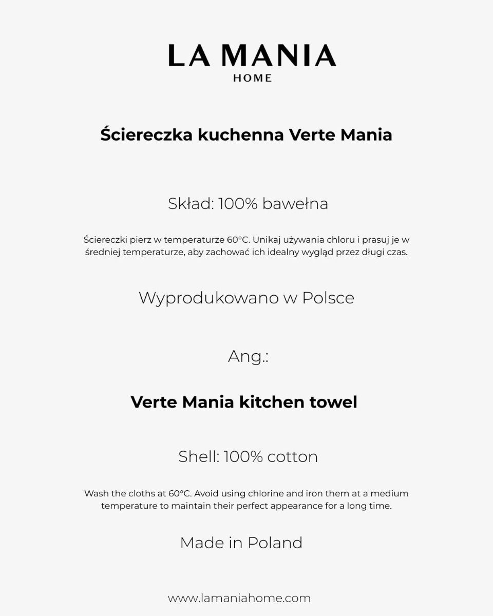 Ściereczka kuchenna Verte Mania w odcieniach przełamanej bieli i delikatnej zieleni zachwyca geometrycznym wzorem, który podkreśla jej ponadczasowy charakter. Wzór w formie subtelnej kratki uzupełnia minimalistyczny logotyp La Mania. Dzięki praktycznej metce, pełniącej jednocześnie funkcję uchwytu, ściereczkę łatwo zawiesić w wybranym miejscu. Wykonana z wysokiej jakości bawełny żakardowej, jest trwała, chłonna i zachowuje nienaganny wygląd przez długi czas. Ściereczkę można prać w temperaturze do 60°C, unikać chloru i prasować w średniej temperaturze. Produkt wyprodukowano w Polsce.