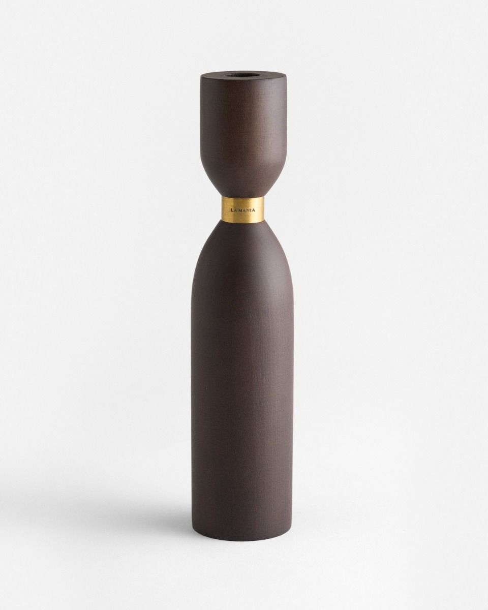 Smukła sylwetka świecznika wznosi się na starannie wykonanym cokole z wysokiej jakości drewna bukowego, zdobionym efektowną mosiężną obręczą. Projekt łączy w sobie funkcjonalność i artystyczny charakter. Świecznik został zaprojektowany jako rzeźba użytkowa. Wykonany z litego drewna bukowego, zachwyca precyzją wykonania i naturalnym rysunkiem słojów. Jego subtelna, płynna forma przywołuje miękkie linie współczesnej architektury, a mosiężny detal podkreśla czystość kształtu i szlachetność zastosowanych materiałów.
