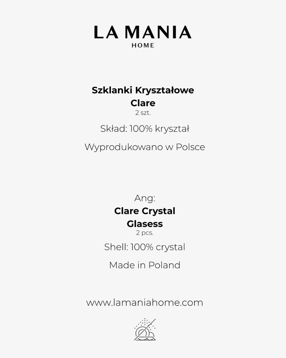 Kolekcja Clare powstała z najwyższej jakości kryształu w polskiej hucie szkła – z pasji do rzemiosła i zamiłowania do piękna. Szklanki doskonale komponują się z pozostałymi elementami kolekcji Clare, tworząc spójną i elegancką całość.