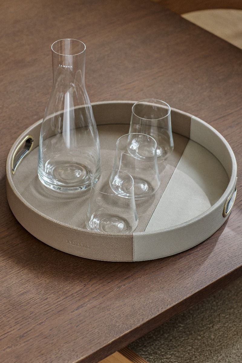 Taca Casse to funkcjonalny element wystroju. Zestawienie taupe i beżu, przeszycia oraz metalowe uchwyty w kolorze jasnego mosiądzu tworzą spójny i zachwycający efekt. Wytłoczone logo La Mania nawiązuje do pozostałych produktów z kolekcji. Sprawdzi się do serwowania lub przechowywania drobiazgów. Wykonana z eko skóry.