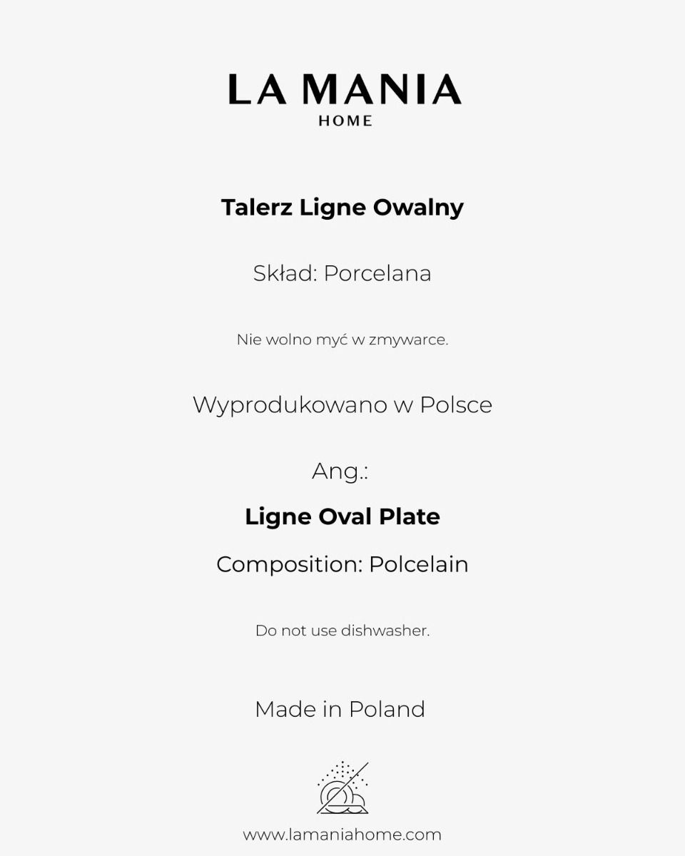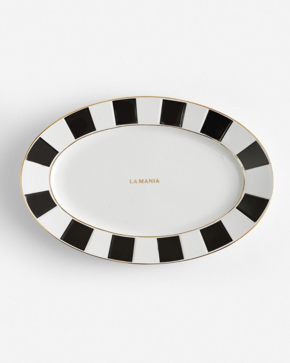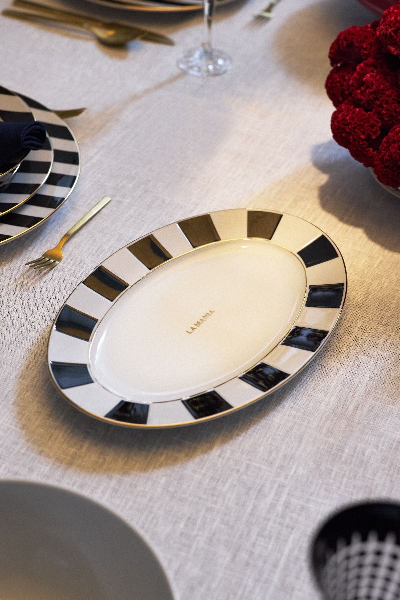 Talerz Ligne Owalny to połączenie minimalistycznej formy i wyrazistego wzoru w pasy, inspirowanego kultową serią Stripes. Klasyczne połączenie czerni i bieli, złoty rant i subtelne logo La Mania, nadają mu ponadczasowego charakteru.
