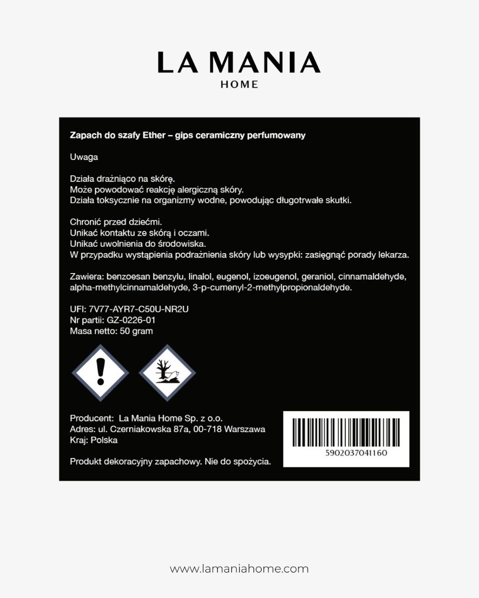 Zapach Ether dedykowany do szafy lub samochodu, jest naszą kultową kompozycją doskonale znaną z przestrzeni butików La Mania. Zamknięty w eleganckiej, gipsowej formie, stopniowo uwalnia aromat, wprowadzając do wnętrza wyjątkową, zmysłową atmosferę.